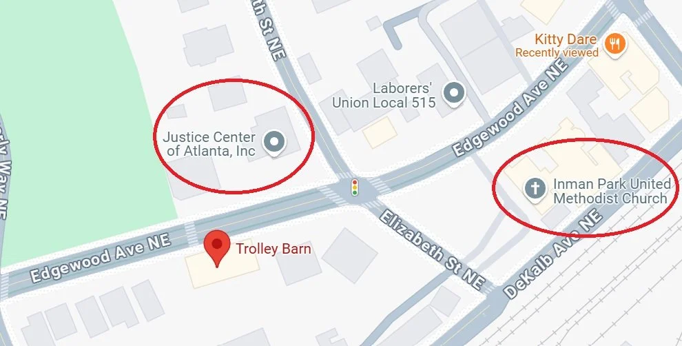 The Trolley Barn is located at 963 Edgewood Ave NE, Atlanta, GA 30307. Parking is available on both sides of Edgewood Avenue (Please DO NOT block driveways).
